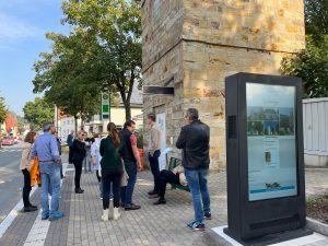 Die Beteiligten der Projekte des BULE-Förderprogramms und die Fördermittelgeber treffen sich einmal jährlich an zwei Tagen zum Erfahrungsaustausch. Das erste Vernetzungstreffen fand im letzten Jahr in Bonn statt. In diesem Jahr fiel die Standortwahl auf Paderborn und Borchen-Etteln. Am 19.10.2024 ließen sich die Teilnehmer:innen die digitalen Lösungen zeigen. Startpunkt des Rundweges mit 16 Stationen war das Gasthaus Dopp in Etteln. Die Führung übernahm Christine Wegner, Projektleiterin DiDoZ bei der Gemeinde Borchen.